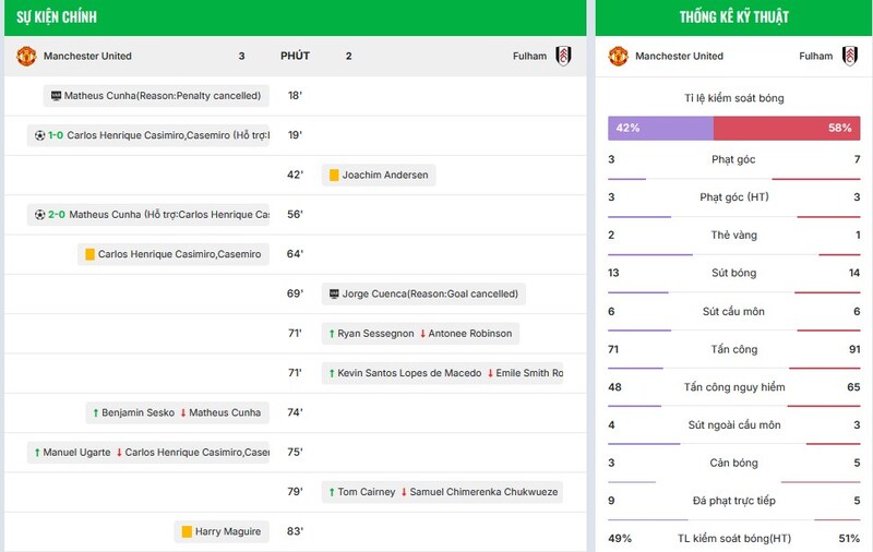 - Thống kê thẻ phạt, cú sút, phạm lỗi, góc