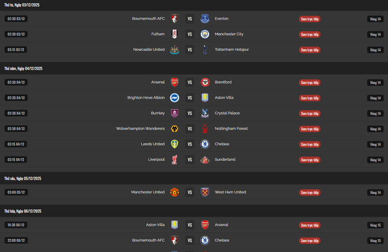 - Giải đấu: Chỉ hiển thị các trận thuộc Ngoại hạng Anh, giúp fan không bị rối mắt với thông tin từ các giải khác.