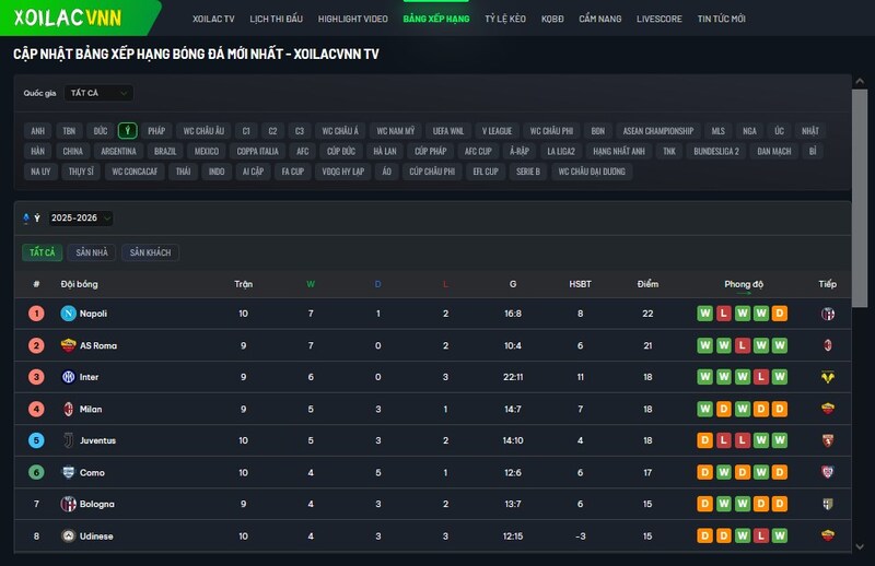 Đặc biệt, Xoilacvn còn cập nhật riêng nhiều giải đấu lớn, trong đó có bảng xếp hạng bóng đá Ý, giúp người hâm mộ Serie A dễ dàng theo dõi cuộc đua đầy khốc liệt giữa những ông lớn như Inter, Milan hay Juventus.